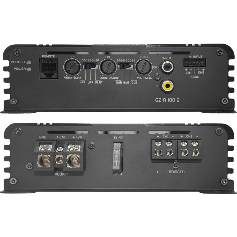 2-Kanal Verstärker mit Class A/B Schaltung, integrierter Aktivweiche und schwarz eloxiertem Kühlkörper