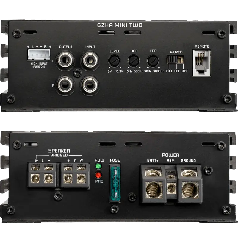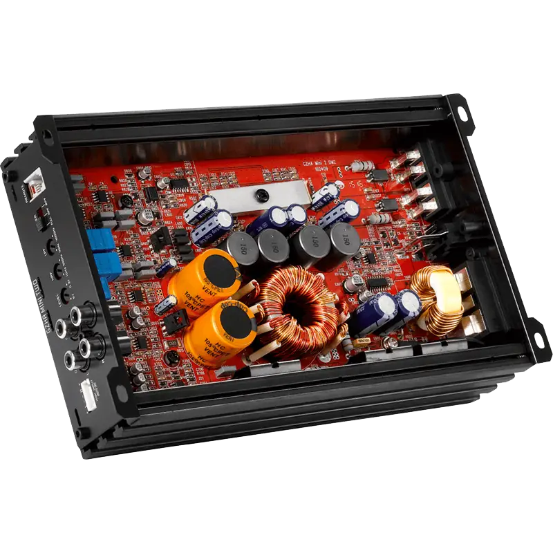 Amplificador de dois canais com circuito classe D eficiente e crossover ativo integrado, dimensões compactas- Amplificador compacto de dois canais