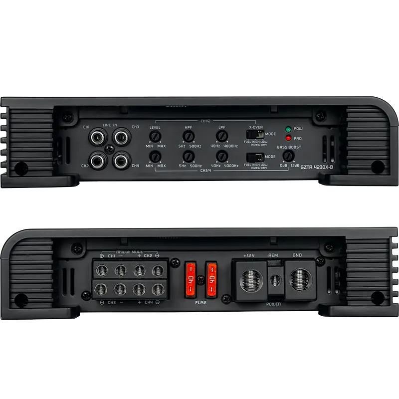 Amplificador de alta qualidade classe A/B com 4 canais, crossover ativo integrado e resfriamento eficiente